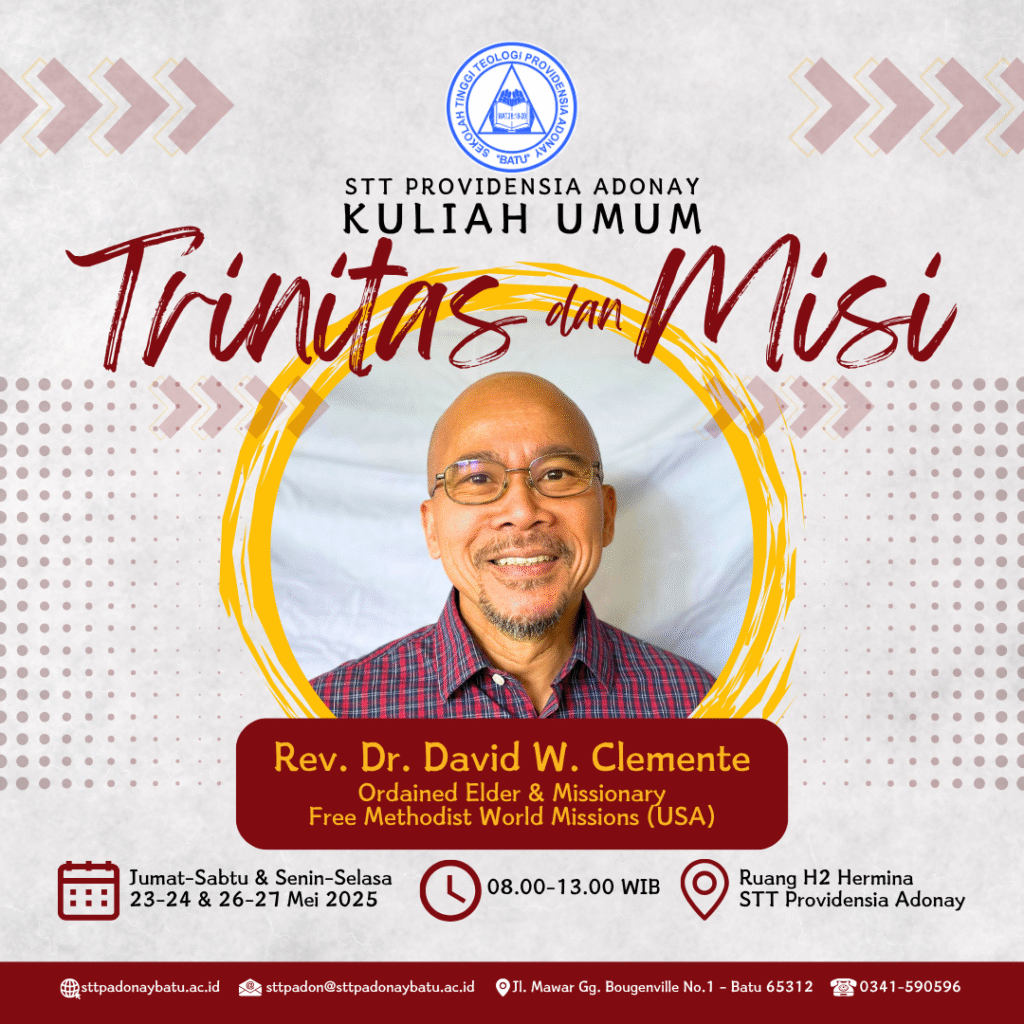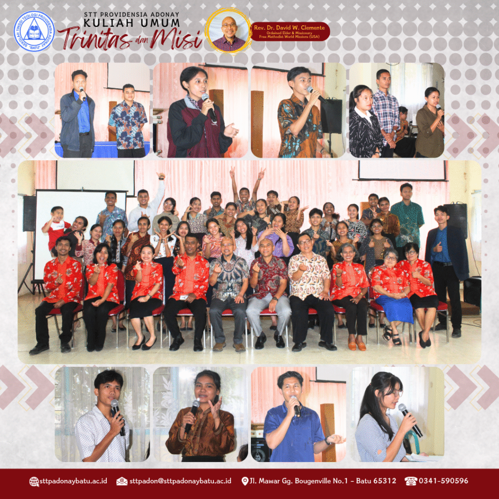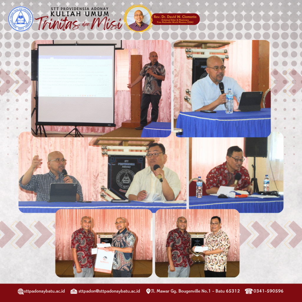 Pada hari Jumat-Selasa tanggal 23, 24, 26, 27 Mei 2025 segenap civitas akademika STT Providensia Adonay berkesempatan mengikuti Kuliah Umum “Trinitas dan Misi” oleh pemateri Rev. Dr. David W. Clemente. Beliau adalah Pendeta dan Misionaris dari Free Methodist World Mission, USA. Selama 4 hari perkuliahan, pemaparan materi oleh Dr. David W. Clemente dibantu oleh penerjemah yaitu Bpk. Danil Iroth, S.Si, M.Div yang selama ini menjadi dosen tamu di STT Providensia Adonay. Dalam 4 hari pelaksanaan kuliah umum ini, ada 4 materi yang dibagi dalam 7 sesi pemaparan dan tanya jawab. Kemudian sesi terakhir ditutup dengan sambutan-sambutan, ucapan terima kasih dan pemberian tanda kasih, foto bersama, dan ramah tamah.