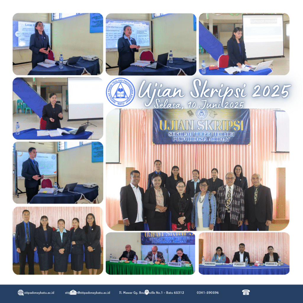 Pada hari Selasa 10 Juni 2025, STT Providensia Adonay melaksanakan Ujian Skripsi untuk menguji skripsi dari 5 mahasiswa Tingkat IV STTPA. Ujian Skripsi dilaksanakan di Ruangan H1 dan H2 Hermina STTPA pada pk. 09.00 WIB – selesai. Adapun peserta Ujian Skripsi 2025 ini ialah: