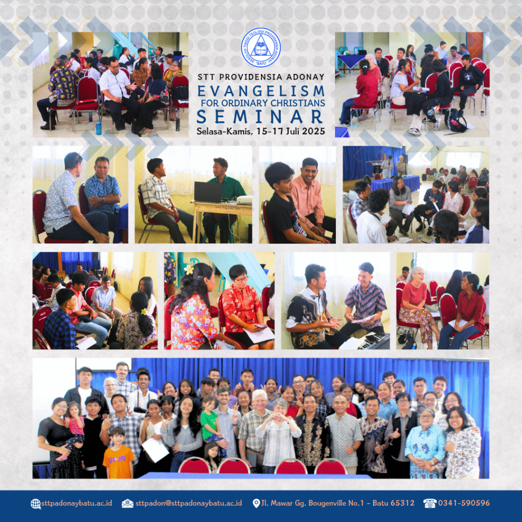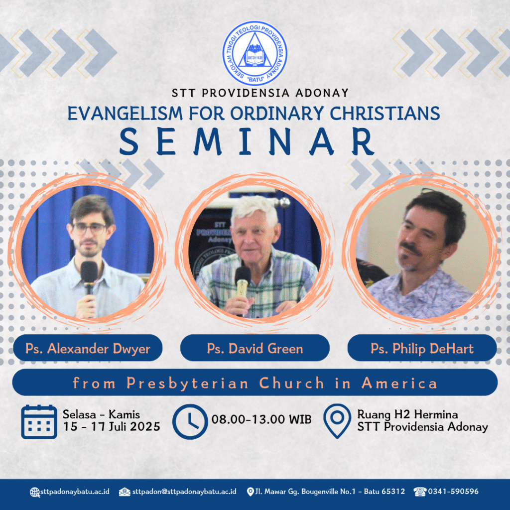 Pada hari Selasa-Kamis 15-17 Juli 2025 dilaksanakan sebuah Seminar dengan tema “Evangelism for Ordinary Christians” yang bertempat di STT Providensia Adonay. Seminar ini merupakan pelayanan penginjilan yang dilakukan oleh 3 Pastor dari Presbyterian Church in America yang sedang melayani di gereja setempat di Malaysia dan berkesempatan mengunjungi Indonesia. 3 Pastor yang tersebut adalah Ps. David Green (pemateri), Ps. Alexander Dwyer (penerjemah), dan Ps. Philip DeHart. Seminar ini terbuka untuk umum, dihadiri oleh seluruh civitas akademika STTPA dan juga peserta dari gereja, lembaga, dan sekolah-sekolah di Batu dan Malang. Dalam 3 hari pelaksanaan, para peserta seminar mempelajari 3 materi utama, dalam bentuk pemaparan, tanya jawab, diskusi kelompok, serta praktik penginjilan. Kemudian sesi terakhir ditutup dengan sambutan-sambutan, ucapan terima kasih dan pemberian tanda kasih, foto bersama, dan ramah tamah.